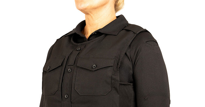 The front placket offers functionality while maintaining a professional uniform appearance. It includes durable melamine buttons, a mic loop, document pockets, and hook/loop front pockets for easy access to essential gear.