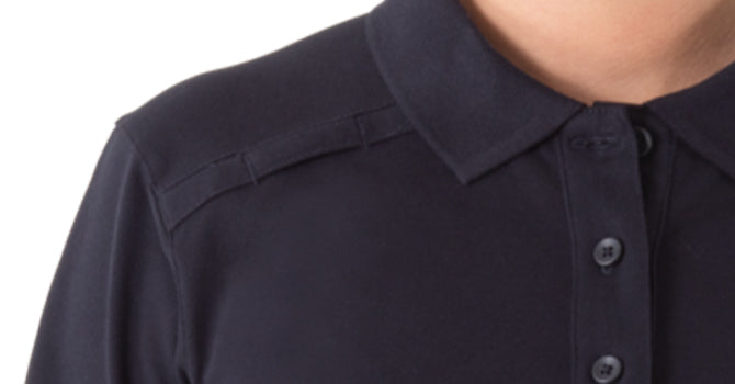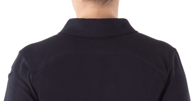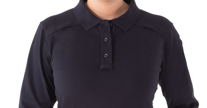 Sleeves ran long & wristband is a bit wide, but overall length shrank in wash so worked out - width, including wristband, didn’t shrink - fabric a bit heavy but durable. Nice, form fit cut for women. The pen pockets and mic strap are great and pen pocket doesn’t invert when constantly used. The collar stays pushed through collar tip in 1st wash and had to be removed. Originally ordered a medium s/s which really is the right size but opted for large due to fabric weight and heat where I work (looser fit) fabric doesn’t “give” much for movement. The s/s large came but was smaller than original s/s medium (which I kept - med.), so returned large hoping lg. was just mis-labeled. Still waiting for exchange. Ordered s/s XL - in case s/s large odd sizing wasn’t an error - fit like a tent - returning, hoping replacement will fit like large L/S. I don’t put medium in dryer to avoid shrinkage, but it needs touch-up with iron.